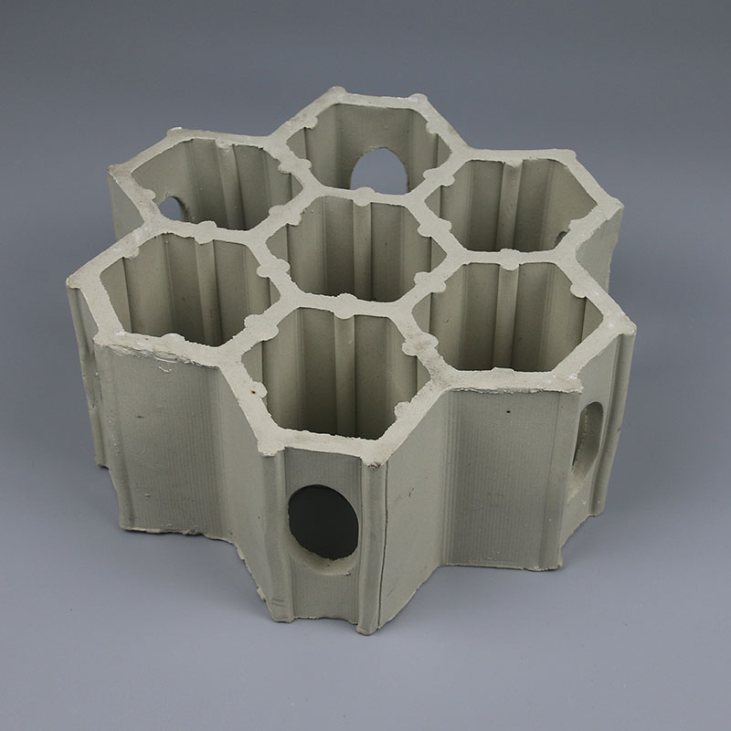 3、傳質(zhì)系數(shù)大、有效面積大、分離效果好經(jīng)過(guò)天津大學(xué)對(duì)輕瓷填料性能的測(cè)定表明,產(chǎn)品傳質(zhì)系數(shù)大,是其他填料的2.2倍。另外,輕瓷填料在裝填好后其相鄰填料只有六個(gè)支撐腿重疊為無(wú)效面積,而且氣液相傳的形式是以‘面’接觸,再加上輕瓷填料是微孔蜂窩陶瓷,具有空間液滴面積和微孔面積,從而使得填料的有效面積>99.5%,具有極佳分離凈化效果。